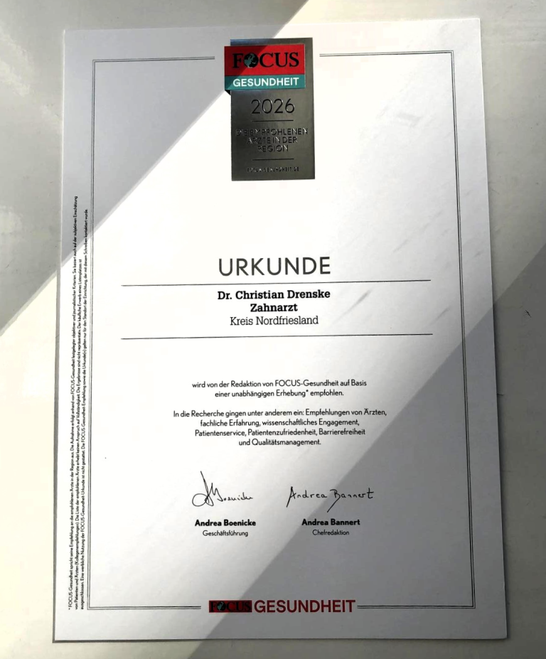 Herr Dr. med. dent. Christian Drenske wird auch im Jahr 2026 wieder offiziell von der Zeitschrift „Focus Gesundheit“ als Zahnarzt und Implantologe empfohlen.